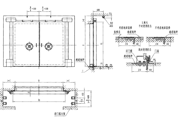 此類門的特點(diǎn)是平時(shí)不設(shè)門檻,地面平整,便于人員或車輛通行;戰(zhàn)時(shí)快速設(shè)置門檻,以滿足防護(hù)、密閉要求。