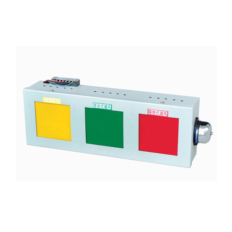 2、燈箱的結(jié)構(gòu):用于工程掩體內(nèi)部空氣質(zhì)量狀態(tài)的顯示和報(bào)警,主要對(duì)三種空氣質(zhì)量情況進(jìn)行報(bào)警:清潔、隔絕、濾毒。燈箱分別用三種顏色的燈光來對(duì)三種不用空氣情況報(bào)警:清潔——綠色燈光;隔絕——紅色燈光;濾毒——黃色燈光。