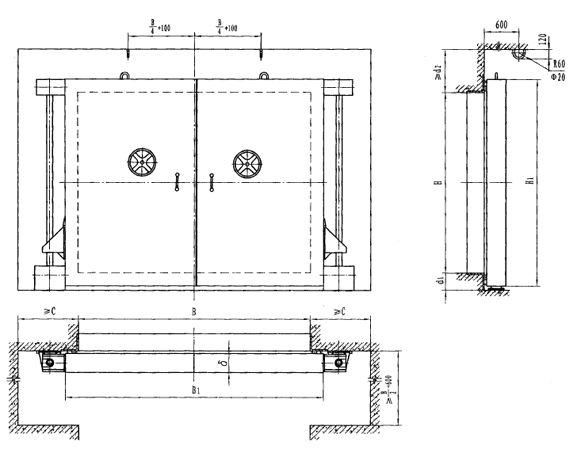 | 型號 | 門孔寬B | 門孔高H | 門扇厚δ | B1 | H1 | C | D1 | D2 |