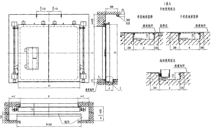 此類門的特點(diǎn)是平時地面無門檻,便于人員和車輛通行;戰(zhàn)時將門扇立轉(zhuǎn)、降落及平移,以滿足防護(hù)、密閉要求,其上帶有方便人員臨時出入的小門,平戰(zhàn)轉(zhuǎn)換快捷。新型降落門改進(jìn)了其升降機(jī)構(gòu),操作更為方便。